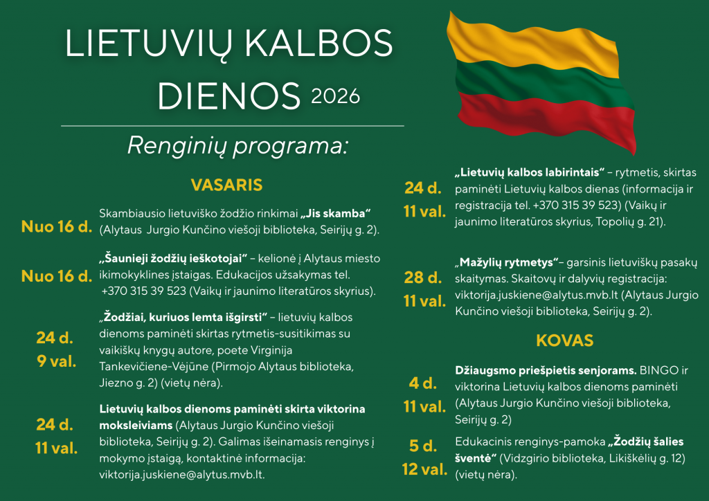 Vasario 24 d. 11 val. Lietuvių kalbos dienoms paminėti skirta viktorina moksleiviams (Alytaus Jurgio Kunčino viešoji biblioteka, Seirijų g. 2). Galimas išeinamasis renginys į mokymosi įstaigą, kontaktinė informacija: viktorija.juskiene@alytus.mvb.lt.