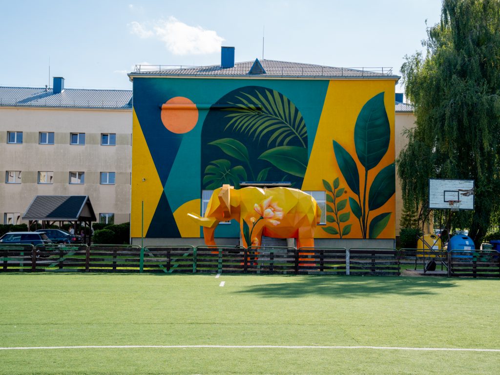 Ryškiai geltonas, gėlėmis apsuptas ir egzotiškų džiunglių fone stovintis dramblys, vardu Mango, nuo praėjusių metų džiugina Alytaus Piliakalnio gimnazijos bendruomenę ir čia užsukančius lankytojus. Tačiau jis ne tik traukia akį – šis beveik keturių metrų aukščio meno kūrinys neša ir svarbią žinią. Jis primena, kad „dramblio kambaryje“ ignoruoti neverta – geriau jį pamatyti ir priimti. Taip pat ir švietime: svarbu pastebėti kiekvieną vaiką, ypač tą, kuriam reikia daugiau dėmesio ir pagalbos.